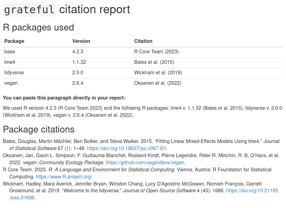 We used R version 4.2.3 [@base] and the following R packages: lme4 v. 1.1.32 [@lme4], tidyverse v. 2.0.0 [@tidyverse], vegan v. 2.6.4 [@vegan].
