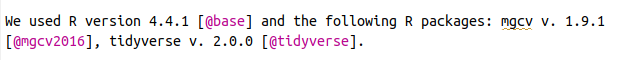 "Para desarrollar este trabajo se utilizó R version 4.5.1 [@base] y los siguientes paquetes: badger v. 0.2.5 [@badger], desc v. 1.4.3 [@desc], knitr v. 1.50 [@knitr2014; @knitr2015; @knitr2025], mgcv v. 1.9.3 [@mgcv2003; @mgcv2004; @mgcv2011; @mgcv2016; @mgcv2017], pkgdown v. 2.1.3 [@pkgdown], remotes v. 2.5.0 [@remotes], renv v. 1.1.5 [@renv], rmarkdown v. 2.29 [@rmarkdown2018; @rmarkdown2020; @rmarkdown2024], testthat v. 3.2.3 [@testthat], tidyverse v. 2.0.0 [@tidyverse], visreg v. 2.7.0 [@visreg]."